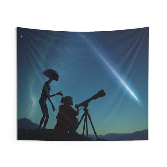 "Alien and Girl Using Telescope" Indoor Wall Tapestries